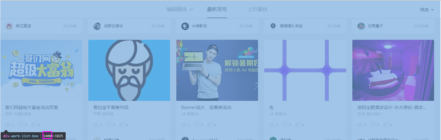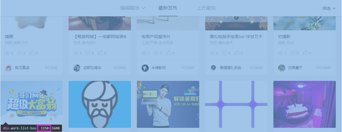 定寬頁面雖然可以免去屏幕適配的煩惱,但是對于有些內(nèi)容,可能會感覺在大屏下顯得過于小氣,體驗并不好,比如圖片。而站酷在這一點上,處理的比較好,可以借鑒。當屏幕寬度大于 1600 時,采用 1400 的定寬;當屏幕小于1600,使用 1150 的寬,同時圖片大小也會發(fā)生改變。(注:淘寶和京東的商品列表頁也采用了類似的處理方式)