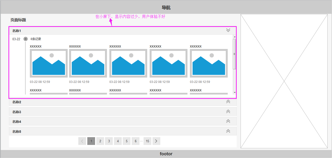 模塊內(nèi)滾動,常用于操作需固定在頂部/底部的頁面。當頁面中有多個模塊需要內(nèi)滾動或者模塊被分割的較小時,需考慮在小屏下每個模塊的可視區(qū)域是否過小而無法進行操作。當數(shù)據(jù)需要分頁時,多采用翻頁分頁。